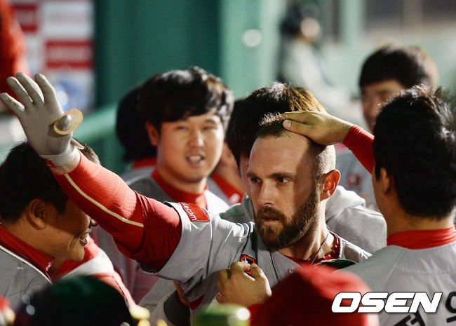 7일 오후 서울 목동구장에서 열린 '2015 타이어뱅크 KBO 리그' 넥센 히어로즈와 SK 와이번스의 와일드카드 결정 1차전, 5회초 SK 선두타자 브라운이 좌월 동점 솔로 홈런을 날린 후 덕아웃에서 동료들과 기쁨을 나누고 있다.