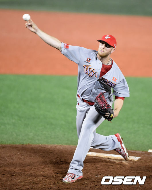 7일 오후 서울 목동구장에서 '2015 타이어뱅크 KBO 리그' 넥센 히어로즈와 SK 와이번스의 와일드카드 결정 1차전, 6회말 SK 켈리가 김광현에 이어 마운드에 올라 역투하고 있다.