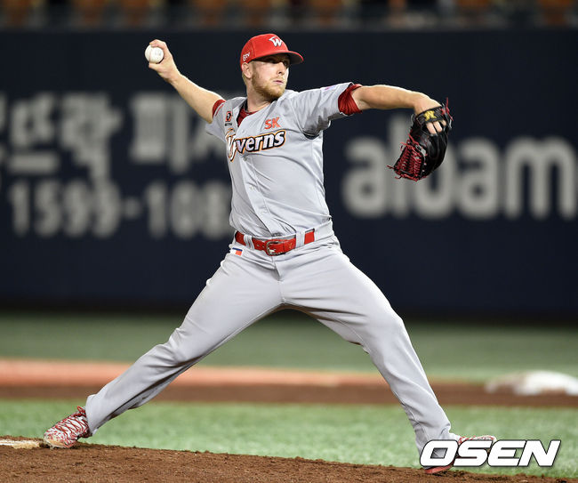 6회말 SK 켈리가 힘차게 공을 던지고 있다.