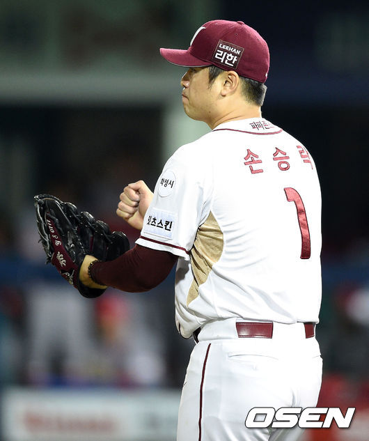 7회초 2사 만루에서 SK 김강민을 파울플라이로 처리한 넥센 손승락이 환호하고 있다.