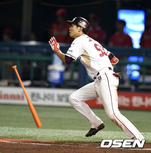7회말 1사 1루에서 넥센 고종욱이 우중간을 가르는 적시 3루타를 치고 있다.