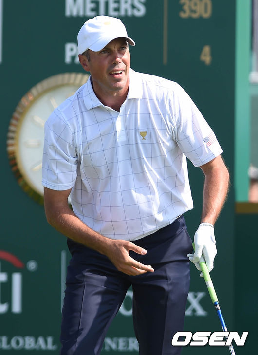 8일 오전 인천 송도 잭 니클라우스GC에서 열린 '2015 프레지던츠컵' 라운드1 포섬 경기에서 매트 쿠차가 티샷을 하고 날아가는 공을 바라보고 있다.