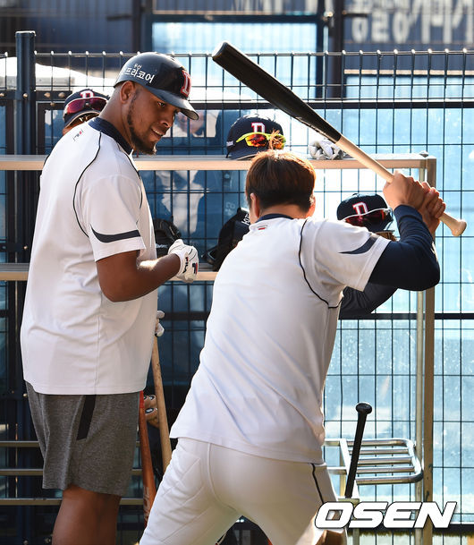 미디어데이를 마치고 두산 선수들이 그라운드에서 훈련을 가졌다. 두산 로메로가 민병헌 옆을 지나가다 민병헌이 스윙 연습을 하자 깜짝 놀라고 있다.