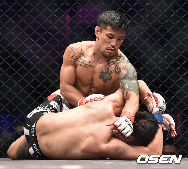 360게임 로드FC 026 3경기, 사사카 신지가 최종찬에게 파운딩 시도 후 주먹을 날리고 있다.