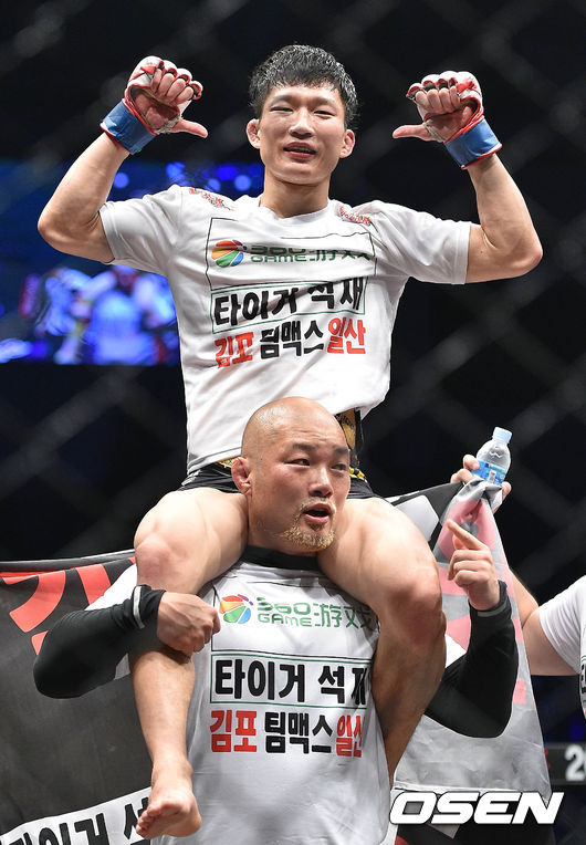 360게임 로드FC 026 6경기, 송민종이 챔피언벨트를 메고 환호하고 있다.