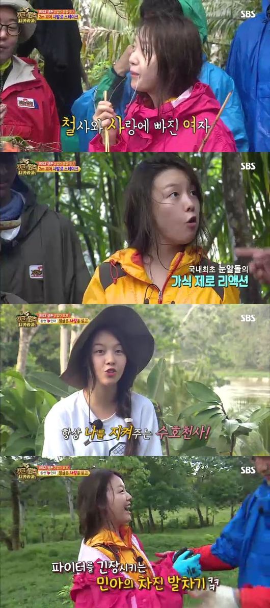 비가 퍼붓는 가운데서 이를 악물고 지켜낸 사발로 구이를 마지막까지 알차게 먹은 민아는 눈알 마니아답게 모두의 시선을 받으며 맛있게 눈알을 먹었다. “완전 고소하다”고 감탄하는 민아에 남자 부족원들은 모두 기함할 수밖에 없었다. 특히 김태우는 “나 태어나서 눈알 먹는 여자 처음 본다”며 혀를 내둘렀지만 민아는 남은 눈알까지 다 먹어 치우면서 가식 제로 리액션을 보여줘 웃음까지 더했다.