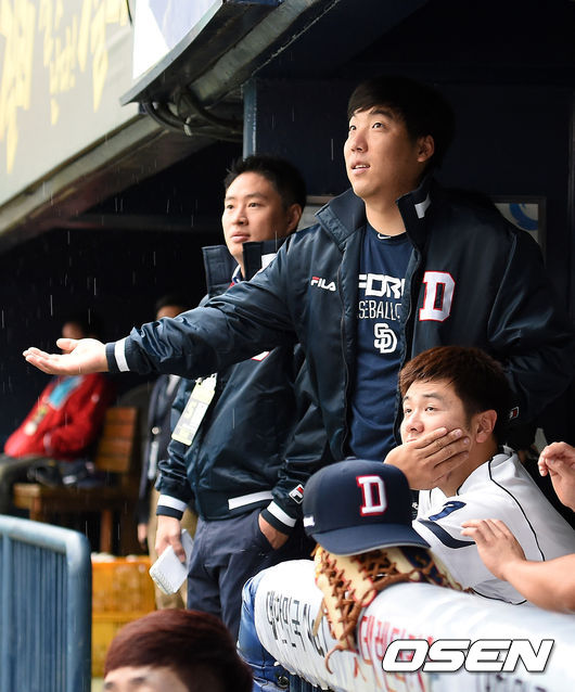 10일 오후 서울 잠실야구장에서 열린 '2015 타이어뱅크 KBO 리그' 포스트시즌 두산 베어스와 넥센 히어로즈의 준플레이오프 1차전, 경기에 앞서 두산 김현수가 내리는 비에 손을 내밀고 그라운드를 바라보고 있다.