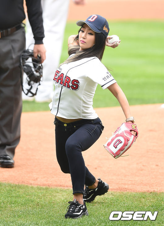 10일 오후 서울 잠실야구장에서 열린 '2015 타이어뱅크 KBO 리그' 포스트시즌 두산 베어스와 넥센 히어로즈의 준플레이오프 1차전, 경기에 앞서 씨스타 효린이 시구를 하고 있다.