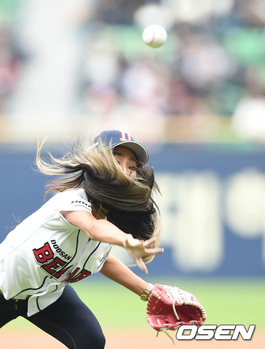 10일 오후 서울 잠실야구장에서 열린 '2015 타이어뱅크 KBO 리그' 포스트시즌 두산 베어스와 넥센 히어로즈의 준플레이오프 1차전,효린이 멋진 폼으로 시구를 하고 있다.