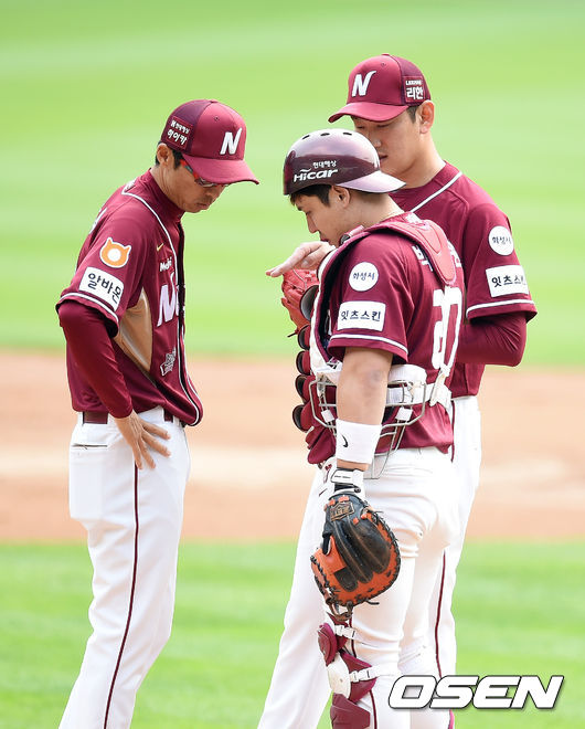 10일 오후 서울 잠실야구장에서 열린 '2015 타이어뱅크 KBO 리그' 포스트시즌 두산 베어스와 넥센 히어로즈의 준플레이오프 1차전, 1회말 2사 만루에서 넥센 손혁 코치가 마운드올라 양훈, 박동원을 격려하고 있다.