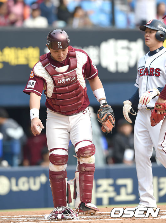10일 오후 서울 잠실야구장에서 열린 '2015 타이어뱅크 KBO 리그' 포스트시즌 두산 베어스와 넥센 히어로즈의 준플레이오프 1차전,1회말 2사 만루 오재원의 스트라이크아웃 낫아웃으로 이닝이 종료되고 있다.