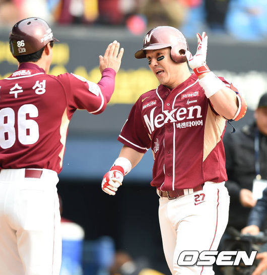 10일 오후 서울 잠실야구장에서 열린 '2015 타이어뱅크 KBO 리그' 포스트시즌 두산 베어스와 넥센 히어로즈의 준플레이오프 1차전,3회초 선두타자 박동원이 솔로홈런을 치고 홈을 밟고 있다.