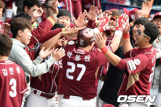 10일 오후 서울 잠실야구장에서 열린 '2015 타이어뱅크 KBO 리그' 포스트시즌 두산 베어스와 넥센 히어로즈의 준플레이오프 1차전, 3회초 무사에서 넥센 박동원이 선제 솔로포를 날리고 동료선숙들과 기뻐하고 있다.