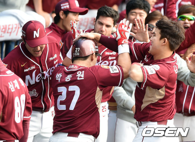 10일 오후 서울 잠실야구장에서 열린 '2015 타이어뱅크 KBO 리그' 포스트시즌 두산 베어스와 넥센 히어로즈의 준플레이오프 1차전, 3회초 무사에서 넥센 박동원이 선제 솔로포를 날리고 동료선수들과 기뻐하고 있다.