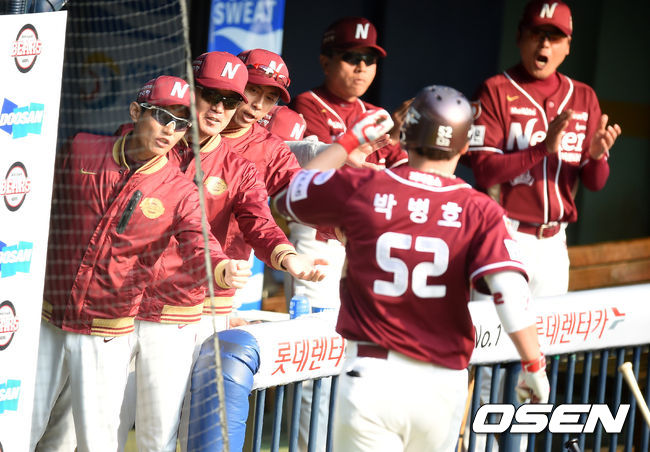 10일 오후 서울 잠실야구장에서 열린 '2015 타이어뱅크 KBO 리그' 포스트시즌 두산 베어스와 넥센 히어로즈의 준플레이오프 1차전, 6회초 2사에서 넥센 박병호가 두산 니퍼트를 상대로 솔로포를 날리고 더그아웃에서 염경엽 감독을 비롯한 코칭스태프와 기뻐하고 있다.
