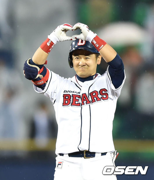 10일 오후 서울 잠실야구장에서 열린 '2015 타이어뱅크 KBO 리그' 포스트시즌 두산 베어스와 넥센 히어로즈의 준플레이오프 1차전,연장 10회말 최주환이 2루타를 치고 하트를 만들고 있다.