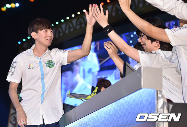 10일 오후 서울 롯데월드 가든스테이지에서‘SK텔레콤 스타크래프트2 프로리그 2015 시즌’(이하 프로리그)' 결승전, 5세트 진에어 이병렬이 승리를 하고 스코어 3-2로 바짝 따라가고 있다.