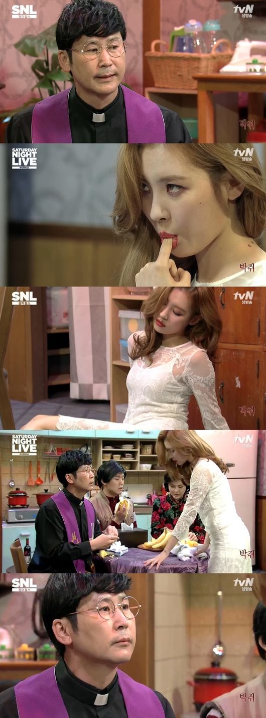 10일 오후 방송된 케이블채널 tvN 'SNL 코리아 시즌6‘에서는 그룹 원더걸스가 호스트로 출연한 가운데 ’박쥐‘ 코너에서 신부님으로 자신을 위장한 뱀파이어 신동엽과 이런 뱀파이어를 유혹하는 선미의 모습이 그려졌다.