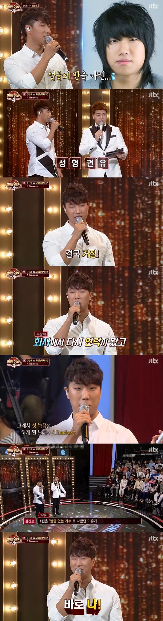 10일 방송된 JTBC '히든싱어4'에는 김진호가 두 번째 원조가수로 나서 모창능력자들과 대결을 펼치는 내용이 전파를 탔다.
