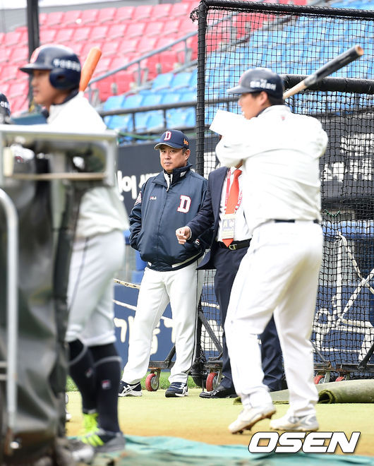 11일 오후 서울 잠실야구장에서 열린 '2015 타이어뱅크 KBO 리그' 포스트시즌 두산 베어스와 넥센 히어로즈의 준플레이오프 2차전, 경기에 앞서 두산 김태형 감독이 훈련하는 선수들을 지켜보고 있다.