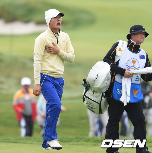11일 오전 인천 송도 잭 니클라우스GC에서 열린 '2015 프레지던츠컵' 최종라운드 싱글 매치에서 데니 리가 세컨샷 후 이동하고 있다.