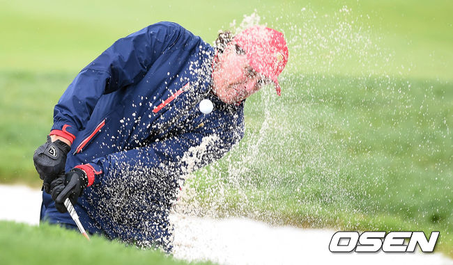 11일 오전 인천 송도 잭 니클라우스GC에서 열린 '2015 프레지던츠컵' 최종라운드 싱글 매치에서 필 미켈슨이 벙커샷을 하고 있다.