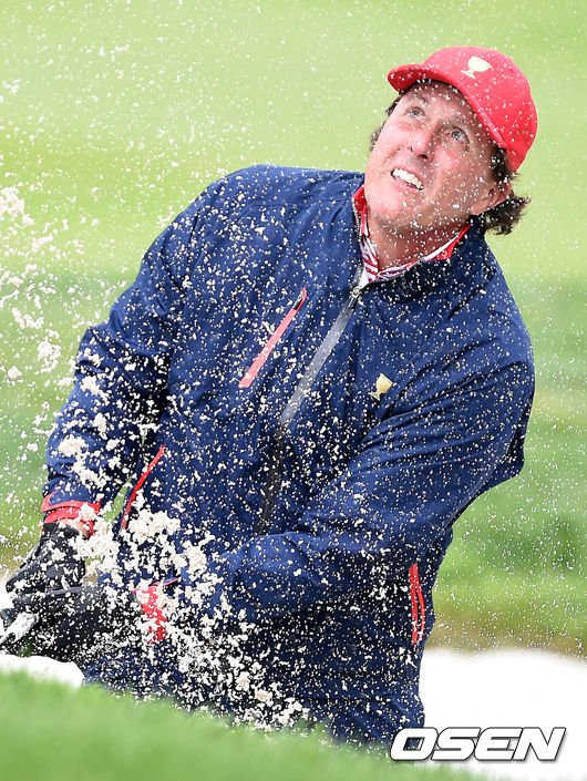 11일 오전 인천 송도 잭 니클라우스GC에서 열린 '2015 프레지던츠컵' 최종라운드 싱글 매치에서 필 미켈슨이 벙커샷을 하고 있다.