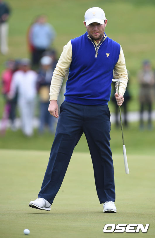 11일 오전 인천 송도 잭 니클라우스GC에서 열린 '2015 프레지던츠컵' 최종라운드 싱글 매치에서 브랜든 그레이스가 퍼팅 후 공을 바라보고 있다.