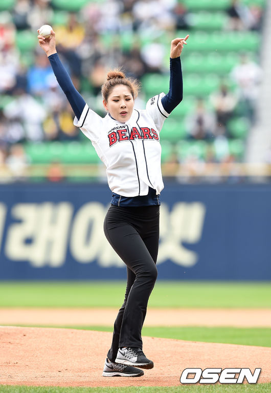 11일 오후 서울 잠실야구장에서 열린 '2015 타이어뱅크 KBO 리그' 포스트시즌 두산 베어스와 넥센 히어로즈의 준플레이오프 2차전, 신수지가 시구를 하고 있다.