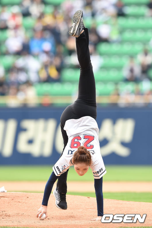 11일 오후 서울 잠실야구장에서 열린 '2015 타이어뱅크 KBO 리그' 포스트시즌 두산 베어스와 넥센 히어로즈의 준플레이오프 2차전, 신수지가 시구를 하고 있다.