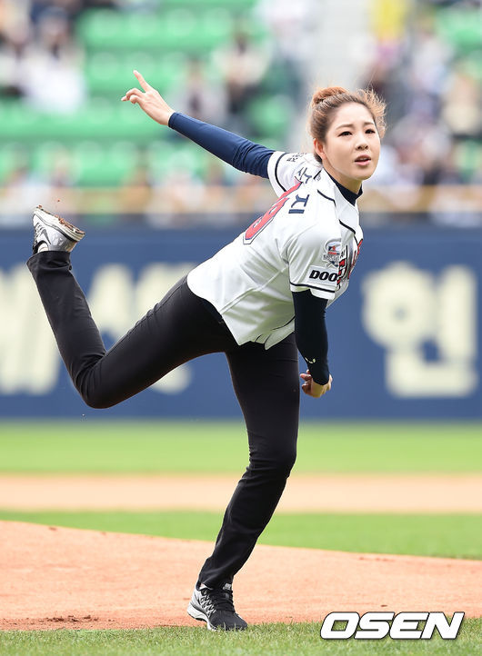 11일 오후 서울 잠실야구장에서 열린 '2015 타이어뱅크 KBO 리그' 포스트시즌 두산 베어스와 넥센 히어로즈의 준플레이오프 2차전, 신수지가 시구를 하고 있다.
