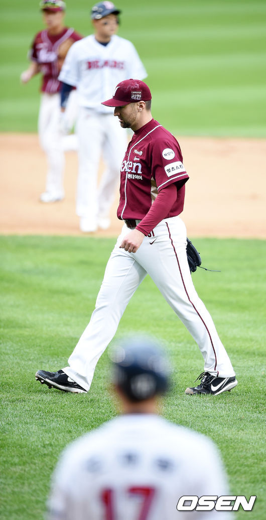 11일 오후 서울 잠실야구장에서 열린 '2015 타이어뱅크 KBO 리그' 포스트시즌 두산 베어스와 넥센 히어로즈의 준플레이오프 2차전, 1회말 2사만루에서 넥센 피어밴드가 두산 오재원을 삼진으로 처리하며 더그아웃으로 향하고 있다.