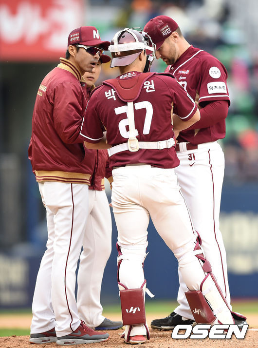 11일 오후 서울 잠실야구장에서 열린 '2015 타이어뱅크 KBO 리그' 포스트시즌 두산 베어스와 넥센 히어로즈의 준플레이오프 2차전, 1회말 2사만루에서 넥센 피어밴드가 볼넷으로 선제점을 허용하자 손혁 코치가 마운드에 올라 이야기를 나누고 있다.