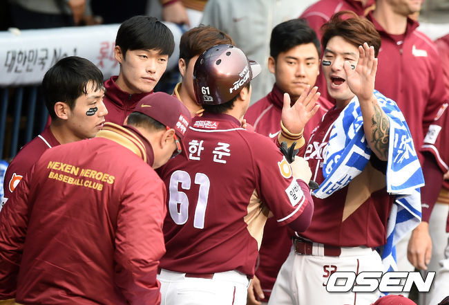 11일 오후 서울 잠실야구장에서 열린 '2015 타이어뱅크 KBO 리그' 포스트시즌 두산 베어스와 넥센 히어로즈의 준플레이오프 2차전, 2회초 1사 1,2루에서 넥센 김하성의 동점 적시타에 유한준이 홈을 밟고 박병호와 기뻐하고 있다.