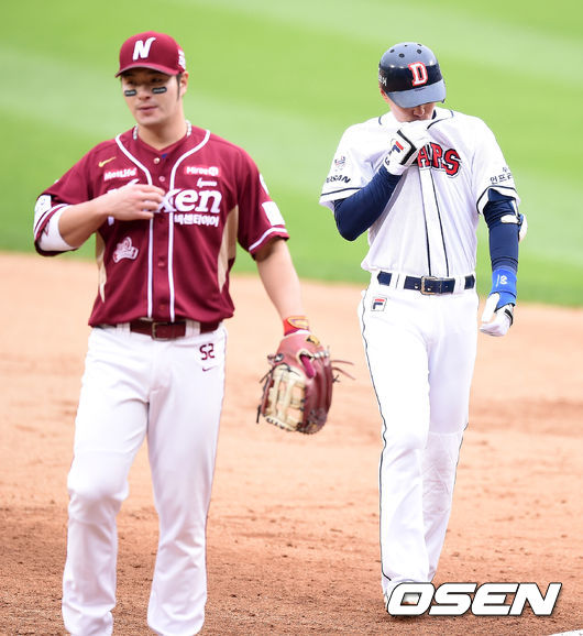 11일 오후 서울 잠실야구장에서 열린 '2015 타이어뱅크 KBO 리그' 포스트시즌 두산 베어스와 넥센 히어로즈의 준플레이오프 2차전, 2회말 1사에서 두산 김재호가 우중간 안타를 날리뒤 기뻐하고 있다.