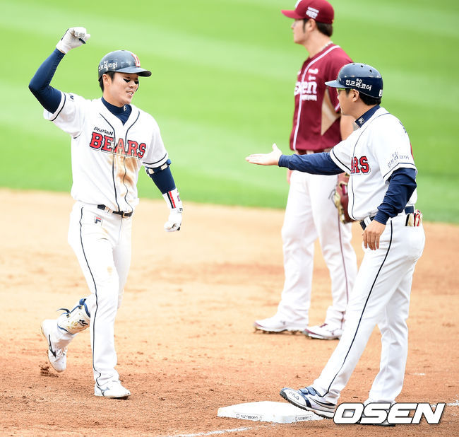 11일 오후 서울 잠실야구장에서 열린 '2015 타이어뱅크 KBO 리그' 포스트시즌 두산 베어스와 넥센 히어로즈의 준플레이오프 2차전, 2회말 2사 2루에서 두산 허경민이 좌전 적시타를 날리고 기뻐하고 있다.