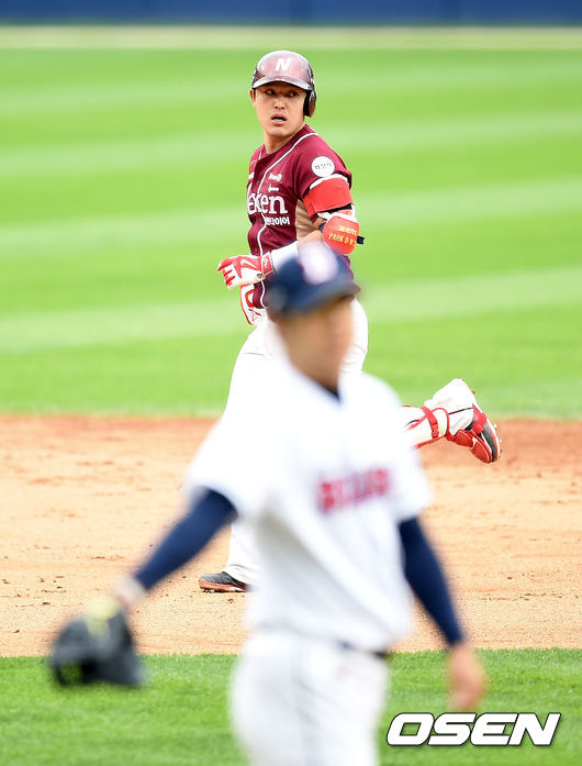 11일 오후 서울 잠실야구장에서 열린 '2015 타이어뱅크 KBO 리그' 포스트시즌 두산 베어스와 넥센 히어로즈의 준플레이오프 2차전, 3회초 무사에서 넥센 박동원이 동점 솔로포를 날리고 그라운드를 돌고 있다.