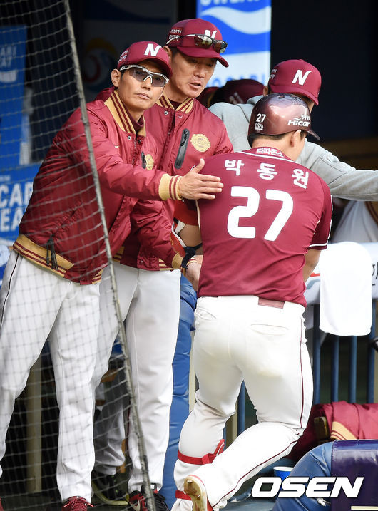 11일 오후 서울 잠실야구장에서 열린 '2015 타이어뱅크 KBO 리그' 포스트시즌 두산 베어스와 넥센 히어로즈의 준플레이오프 2차전, 3회초 무사에서 넥센 박동원이 동점 솔로포를 날리고 더그아웃에서 염경엽 감독과 기뻐하고 있다.