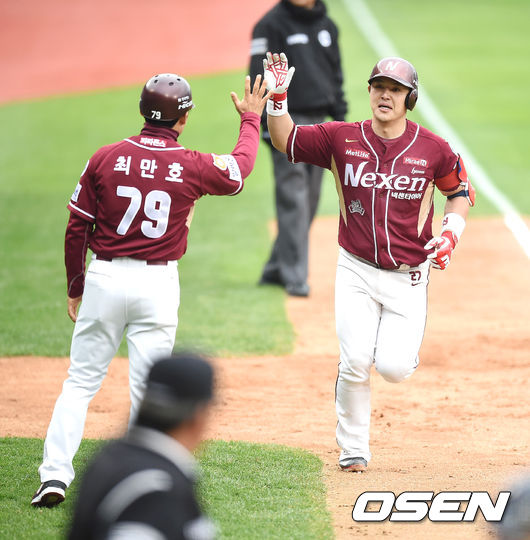 11일 오후 서울 잠실야구장에서 열린 '2015 타이어뱅크 KBO 리그' 포스트시즌 두산 베어스와 넥센 히어로즈의 준플레이오프 2차전, 3회초 무사에서 넥센 박동원이 동점 솔로포를 날리고 최만호 코치와 기뻐하고 있다.