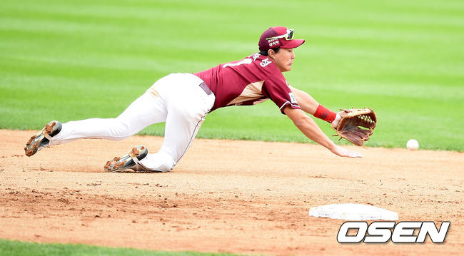 11일 오후 서울 잠실야구장에서 열린 '2015 타이어뱅크 KBO 리그' 포스트시즌 두산 베어스와 넥센 히어로즈의 준플레이오프 2차전, 3회초 2사 1루에서 넥센 김하성이 두산 오재원의 중전 안타 타구에 몸을 날리고 있다.
