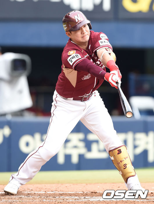 11일 오후 서울 잠실야구장에서 열린 '2015 타이어뱅크 KBO 리그' 포스트시즌 두산 베어스와 넥센 히어로즈의 준플레이오프 2차전, 4회초 1사 주자없는상황에서 김민성이 우익수 오른쪽으로 떨어지는 2루타를 때리고 있다.