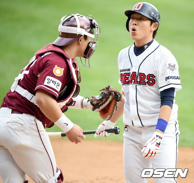 11일 오후 서울 잠실야구장에서 열린 '2015 타이어뱅크 KBO 리그' 포스트시즌 두산 베어스와 넥센 히어로즈의 준플레이오프 2차전, 4회말 1사에서 두산 정수빈이 삼진으로 물러나고 있다.