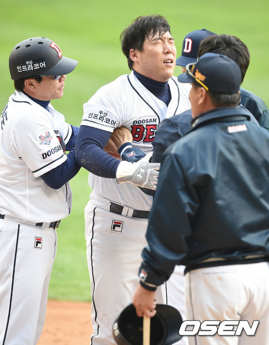 11일 오후 서울 잠실야구장에서 열린 '2015 타이어뱅크 KBO 리그' 포스트시즌 두산 베어스와 넥센 히어로즈의 준플레이오프 2차전, 5회말 1사 만루에서 두산 김현수가 오재원의 중견수 플라이에 태그업, 넥센 박동원의 태그에 앞서 세이프됐다. 이 과정에서 박동원과 충돌한 김현수가 괴로운 표정을 짓고 있다.