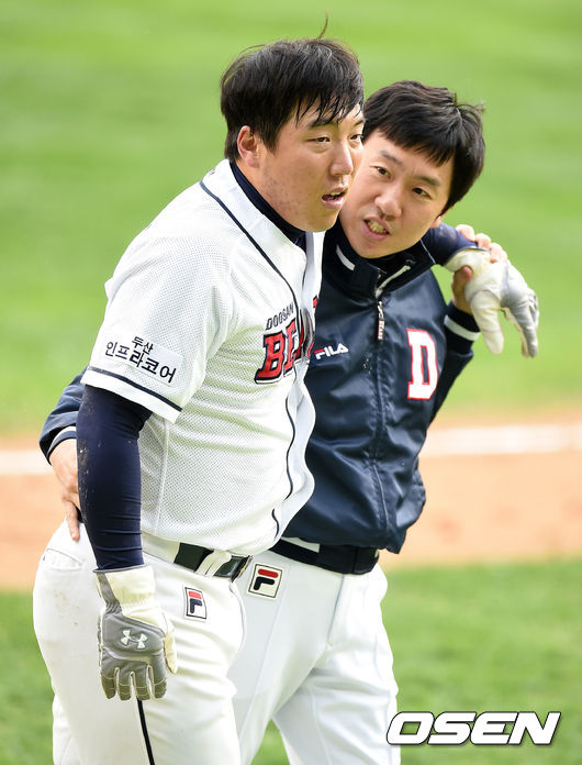 11일 오후 서울 잠실야구장에서 열린 '2015 타이어뱅크 KBO 리그' 포스트시즌 두산 베어스와 넥센 히어로즈의 준플레이오프 2차전, 5회말 1사 만루에서 두산 김현수가 오재원의 중견수 플라이에 태그업, 넥센 박동원의 태그에 앞서 세이프됐다. 이 과정에서 박동원과 충돌한 김현수가 괴로운 표정을 짓고 있다.