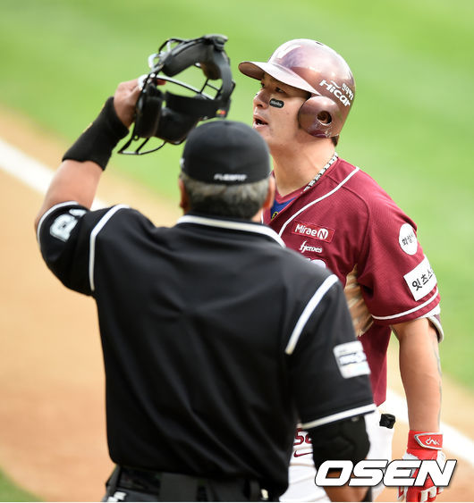 11일 오후 서울 잠실야구장에서 열린 '2015 타이어뱅크 KBO 리그' 포스트시즌 두산 베어스와 넥센 히어로즈의 준플레이오프 2차전, 6회초 1사에서 넥센 박병호가 삼진을 당하며 전일수 구심에 아쉬움을 표하고 있다.