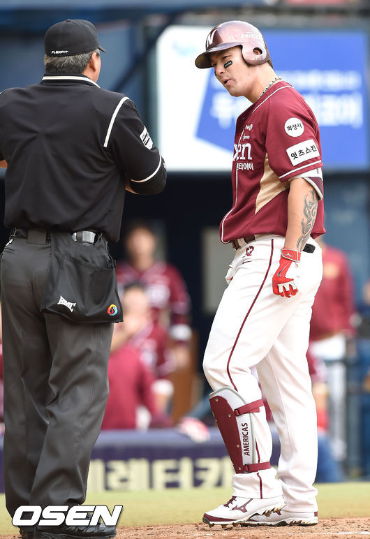 11일 오후 서울 잠실야구장에서 열린 '2015 타이어뱅크 KBO 리그' 포스트시즌 두산 베어스와 넥센 히어로즈의 준플레이오프 2차전, 6회초 1사 삼진을 당한 박병호가 심판에게 판정에 대한 항의를 하고 있다.