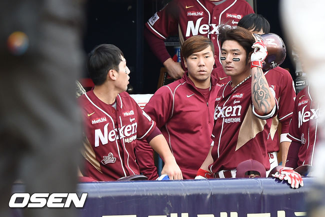 11일 오후 서울 잠실야구장에서 열린 '2015 타이어뱅크 KBO 리그' 포스트시즌 두산 베어스와 넥센 히어로즈의 준플레이오프 2차전, 6회초 1사 삼진을 당한 박병호가 덕아웃으로 들어와 심판을 바라보고 있다.