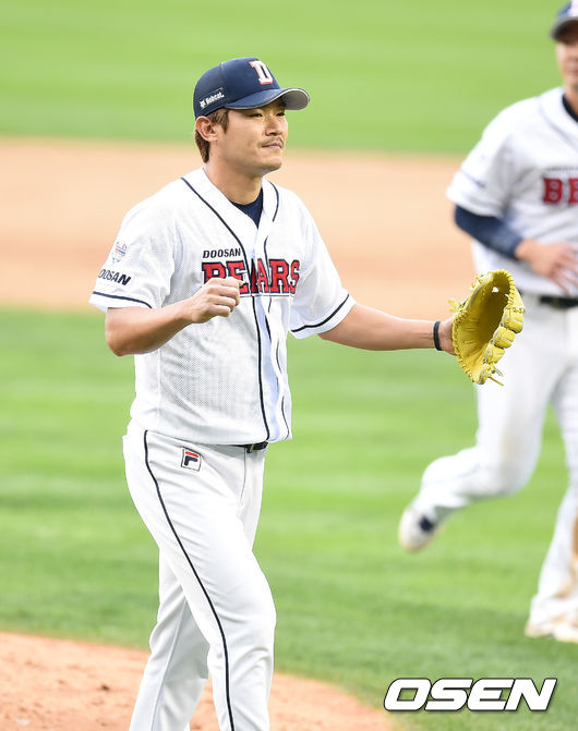 11일 오후 서울 잠실야구장에서 열린 '2015 타이어뱅크 KBO 리그' 포스트시즌 두산 베어스와 넥센 히어로즈의 준플레이오프 2차전, 7회초 마운드에 오른 두산 노경은이 삼자범퇴로 처리하며 주먹을 불끈쥐고 있다.