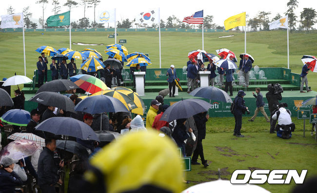 11일 오후 인천 송도 잭 니클라우스GC에서 열린 '2015 프레지던츠컵' 종료 후 폐막식에서 강풍을 동반한 소나기가 내리자 식장이 어수선해지고 있다.