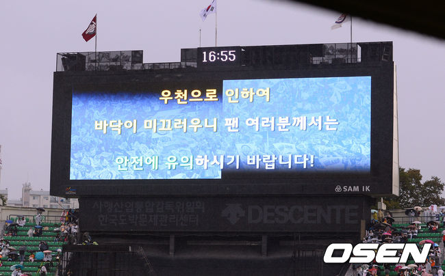 11일 오후 서울 잠실야구장에서 열린 '2015 타이어뱅크 KBO 리그' 포스트시즌 두산 베어스와 넥센 히어로즈의 준플레이오프 2차전, 8회초 우천으로 인하여 경기가 중단되고 있다.